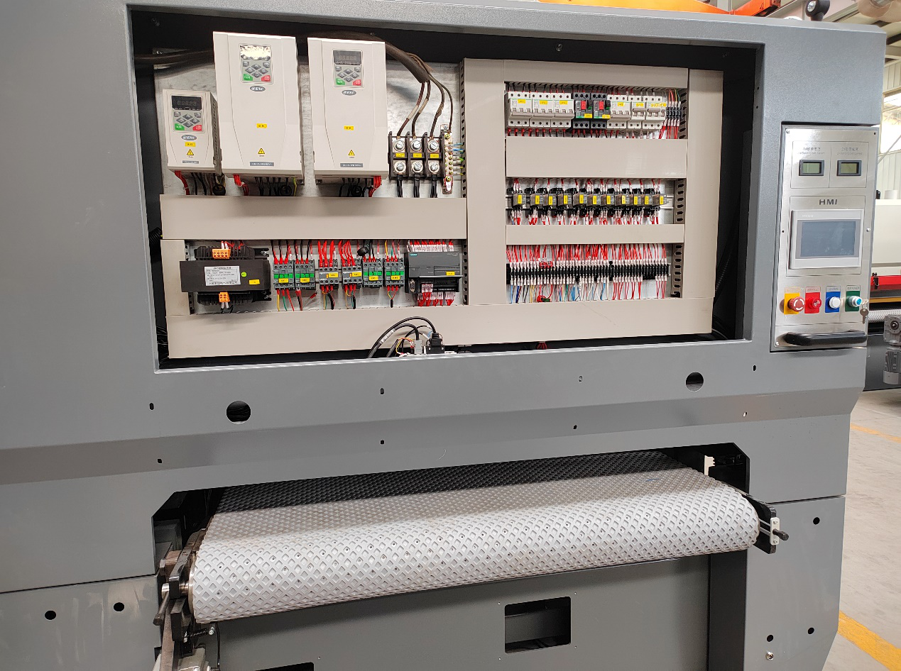 采用万象城AWCENA100系列变频器,控制砂带旋转速度和送料速度的自动化砂光机,可实现无级变速,降低人力需求、增进产能。送料电机配有一个编码器用于计算加工量及工件位置。砂架、砂头的数量可根据实际需求增减,由PLC程序控制多台变频器驱动砂带电机运行,顺利获得无极调速功能,满足各种材质的加工需求。砂光机设备可根据加工量增加而启动气阀,进行自动进给补偿,保证砂头不会因磨轮的磨损而改变砂削效果,保证成品的规格统一。